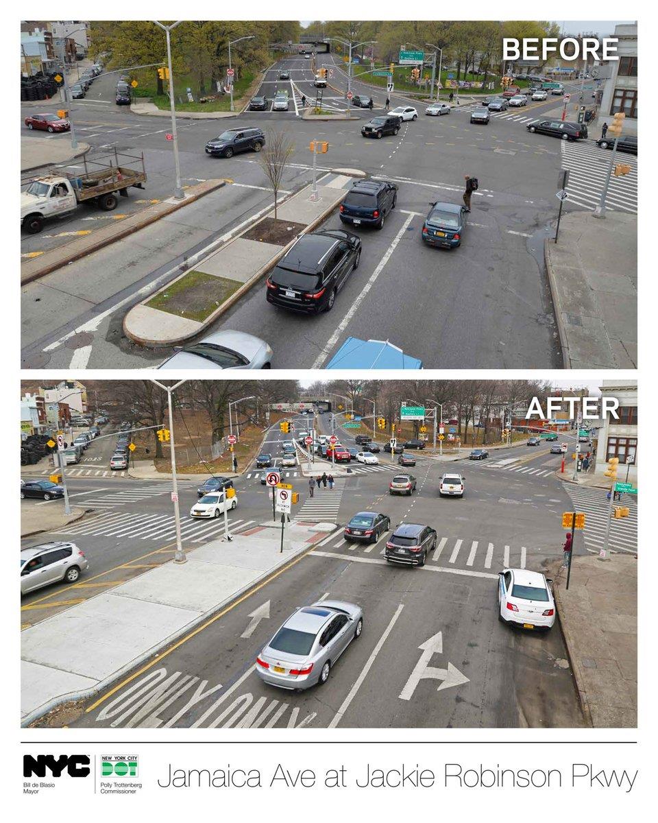 Jamaica - NYC DOT released image of before and after. Its a picture of the intersection of Jackie Robinson Parkway and Jamaica Avenue. Marked with white lanes for pedestrian safety. Reported 11:45am.