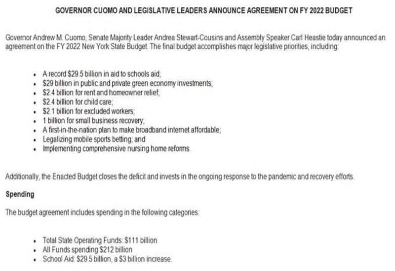$92 billion plus $120 from the federal added to $212 billion for NYS and the budget has been agreed to be spent by both chambers after votes. With NYS deficit, helping Biden win returned the favor to fill the gap and expect more money in the upcoming weeks. Now the governor can relax with his popularity soaring to all who will get the funds. At the same time, more people will be under government programs with newly created organizations by local politicians. As for the increase in tax the wealthy, it will affect around 50,000 residents but many are moving out of the state and it’s no big deal due to federal backing. Here is the entire budget outline, https://www.governor.ny.gov/.../governor-cuomo-announces...