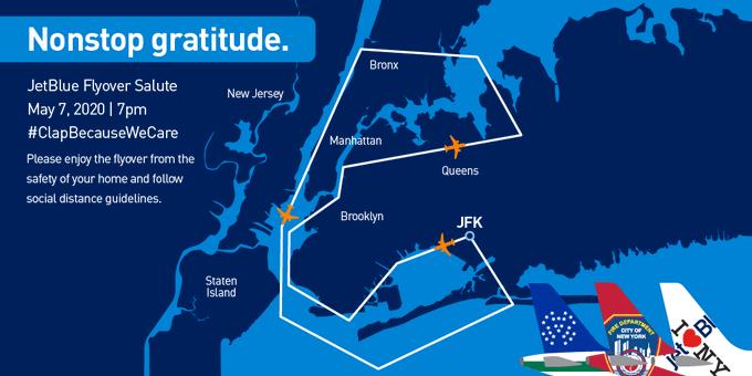 May 7 t 7pm, 3 JetBlue A320 planes will flyover Manhattan, Queens and the Bronx saluting the frontline workers. The aircrafts will fly around 2,000 feet. Also, Governor Cuomo announced JetBlue is donating a pair of round-trip flights to 100,000 medical personnel and nurses to honor their efforts, beginning with 10,000 NY medical professionals.