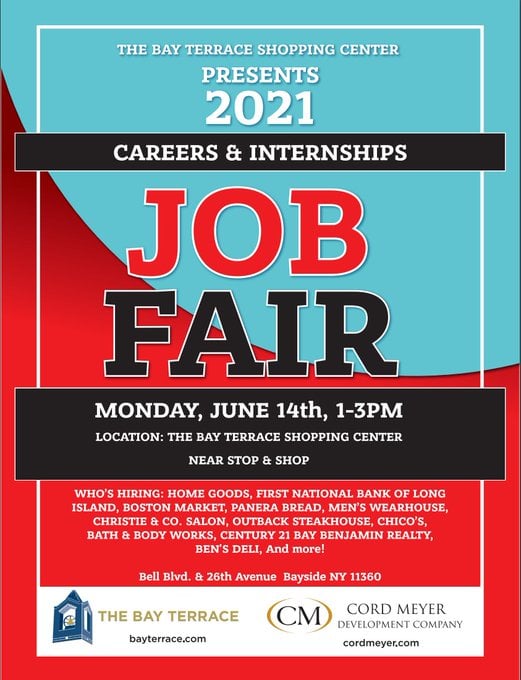 Monday, June 14, there will be a job fair organized by stores inside the Bay Terrace shopping center in Bayside. Located at 212-25 46th Avenue. The event will be held from 1 to 3pm. Open to the public.