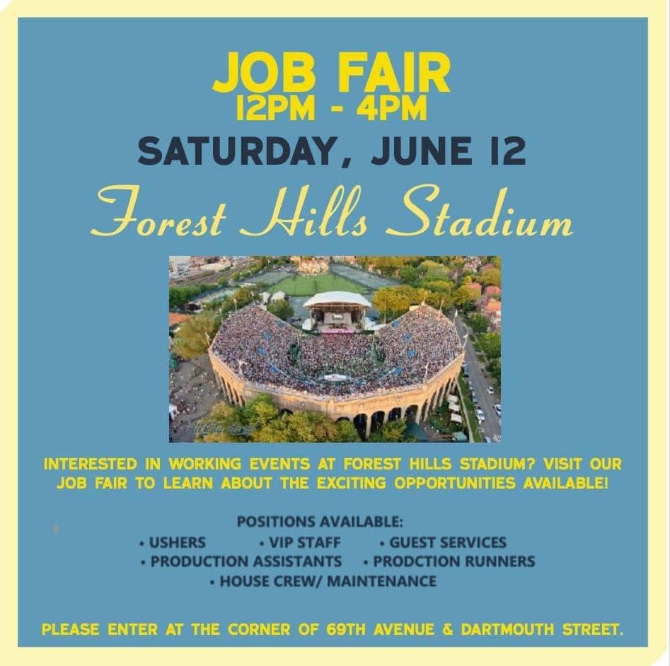 Saturday, June 12 from 12pm to 4pm, there will be a job fair at Forest Hills Stadium in Forest Hills. This is for the upcoming events at the stadium. Located at 1 Tennis Place. The event is open to the public.