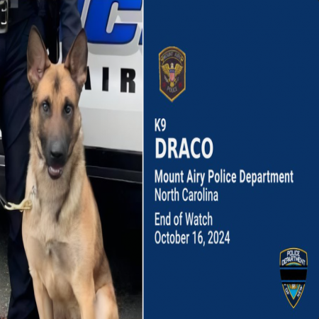 Law enforcement nationwide offer deepest condolences to the family, friends, and colleagues of K9 Draco from the Mount Airy Police Department. K9 Draco was shot and killed while apprehending a murder suspect, and his loss is deeply felt. May he rest in peace.