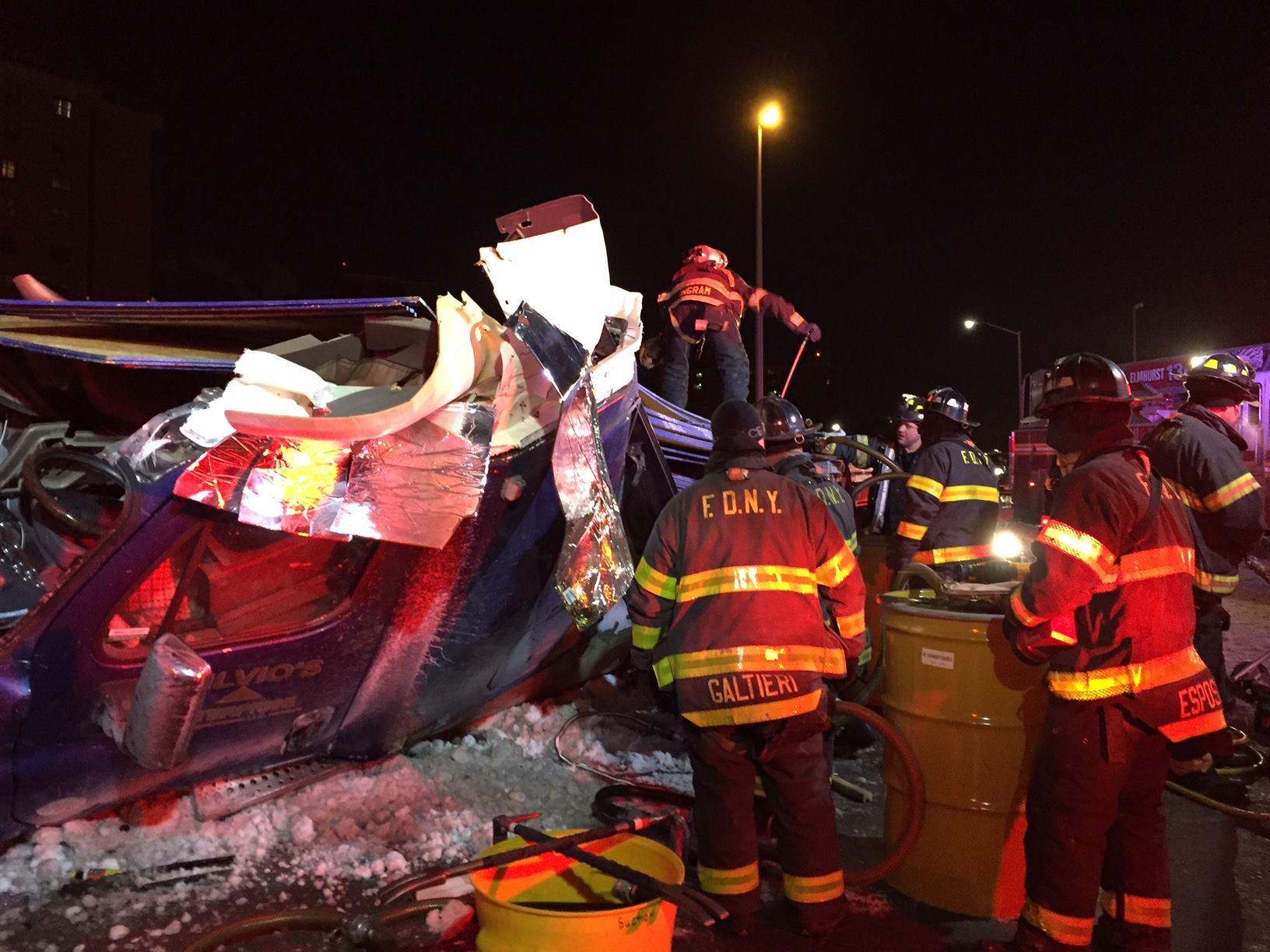FDNY reporting accident involving a tractor trailer on LIE westbound at Grand Central Parkway at 5:30am. The tractor trailer hit a barrier and flipped upside down causing items from the truck fall over the highway. LIE was closed until clean ups. The driver suffered minor injuries. pic by FDNY.