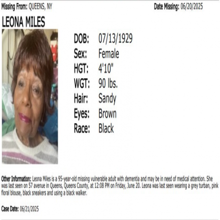 Leona Miles, F/B/95, from Queens, NY. This missing has dementia & may be in need of medical attention.