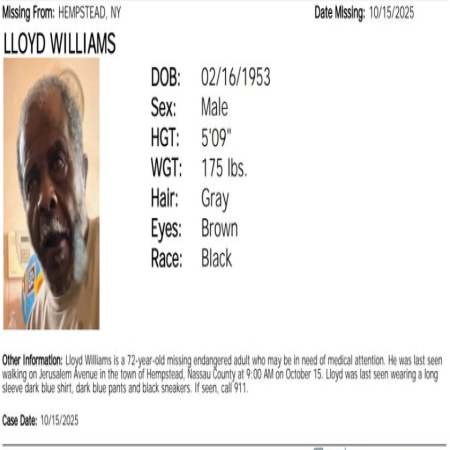 Lloyd Williams male/black/72, from Hempstead, NY. The missing may be in need of medical attention.