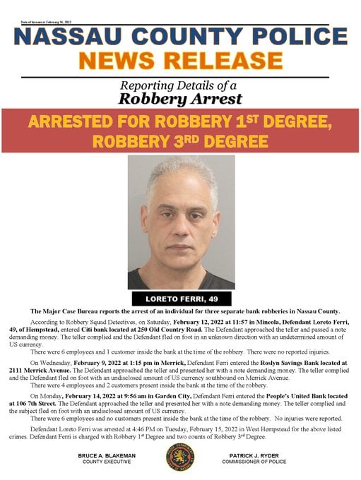 The NCPD reported the alleged suspect wanted for three bank robberies in Nassau County has been arrested. The locations are Garden City, Mineola and Merrick. Police tracked the vehicle to an address in Hempstead.