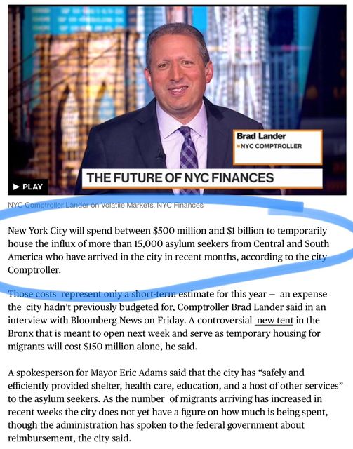 The NYC Comptroller stated the budget is moving to allocate the migrants coming from the south border. As of today, between $500 million to $1 billion is available for all with all necessities.