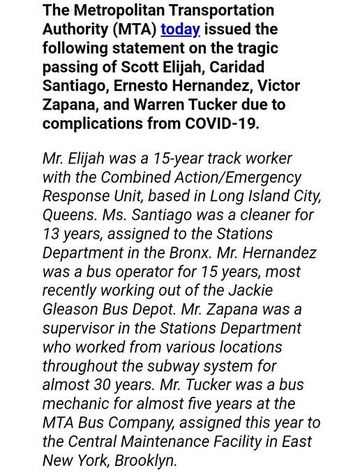 The MTA released a press statement of workers died from coronavrus while serving NYC. Everyday, men and women put their lives for the city and staying safe is the biggest risk they face.