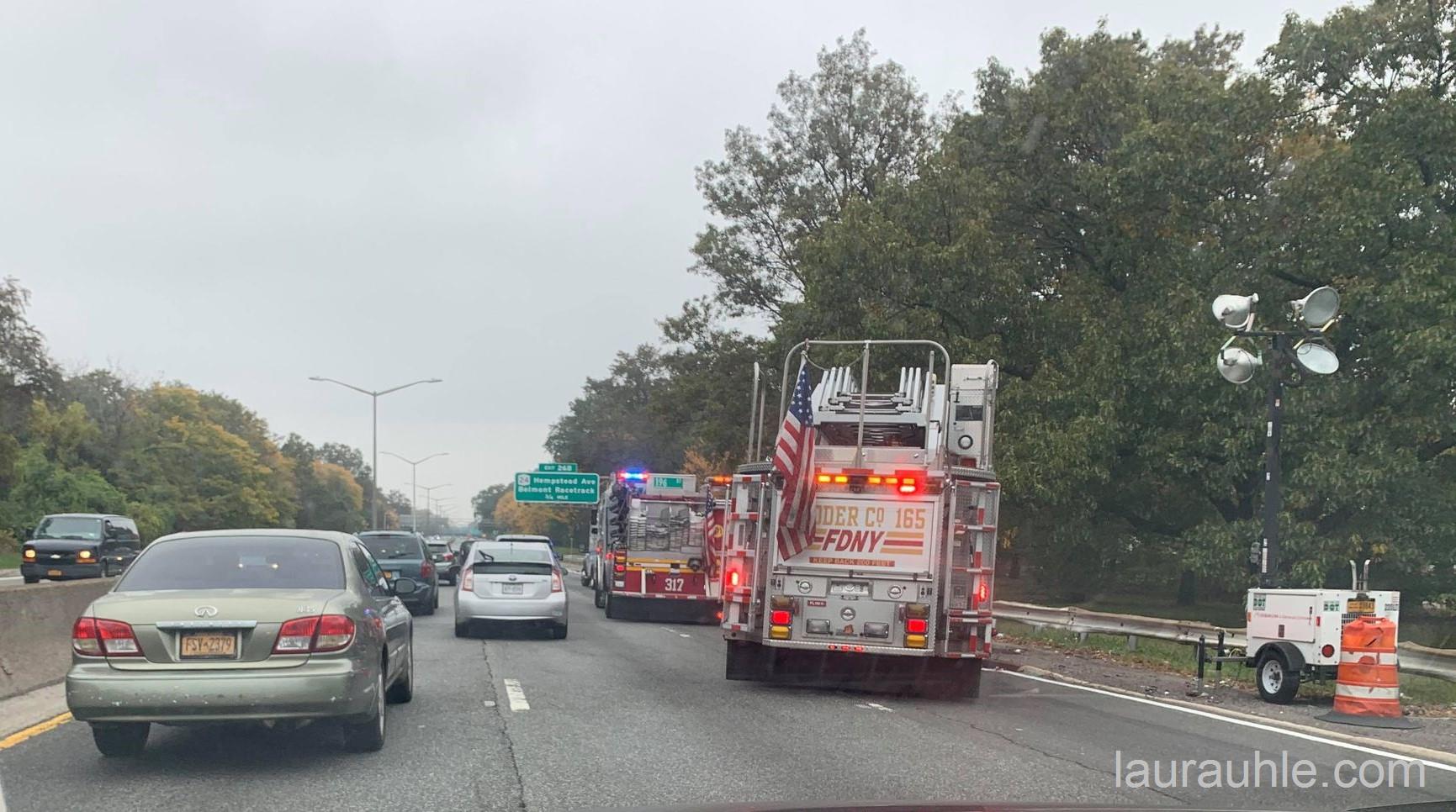 Cross Island Parkway northbound before the Belmont Racetrack, two lanes closed due to multiple vehicle accident with injuries. Police, EMS and FDNY are on the scene. Delays all around.