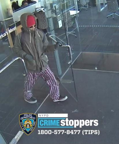 Police released photo of the suspect wanted for the bank robbery in Queens Village. The incident happened on February 14 around 10:15am at the TD Bank on Jamaica Avenue. The suspect wearing pajama pants entered the bank and passed a note demanding cash. From there, the suspect took off on foot with $500 cash. If seen, call 911.