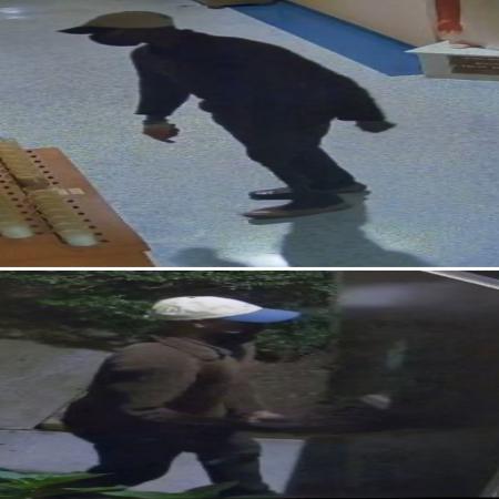 The suspect is described as a male Black, approximately 5’10” with a thin build, wearing a white hat with a blue brim, brown sweater, black pants and a black face covering.