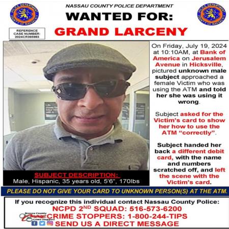 Man wanted for Grand Larceny in Hicksville