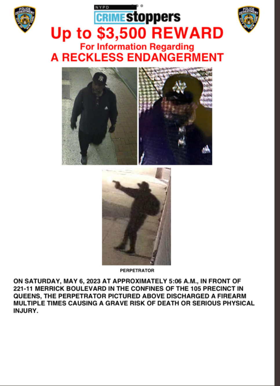 A man is wanted for reckless endangerment in Queens. He fired a gun multiple times in front of 211-11 Merrick Blvd. causing the risk of serious injury or death to innocent individuals. Up to $3,500 REWARD For Information Regarding a RECKLESS ENDANGERMENT! Anyone with information about this incident please contact 1-800-577-8477(TIPS