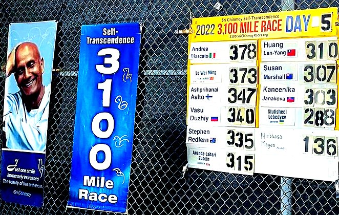 The 26th Annual Sri Chinmoy Self-Transcendence 3100 mile race started on September 4 and will continue until October 25. Those enrolled must run 60 miles a day for 52 straight days to reach 3,100 miles. The course in Jamaica, NY is 0.5488 mie loop near 164 Street and Highland Court where the headquarter is. That's 10 laps daily to reach 5,649 laps to meet the goal. As of today, many dropped out while others continue.