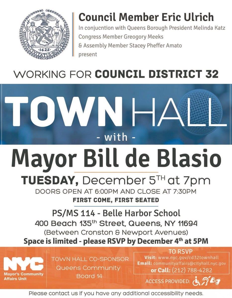 The Republican strong base of Howard Beach and the current sole NYC Council member Eric Ulrich is having town hall meeting with Mayor di Blasio. However, it will not be in Ulrich's zoned area but far away in Belle Harbor School. Tuesday, December 5 at 7pm in PS/MS 114 school. Open to the public.