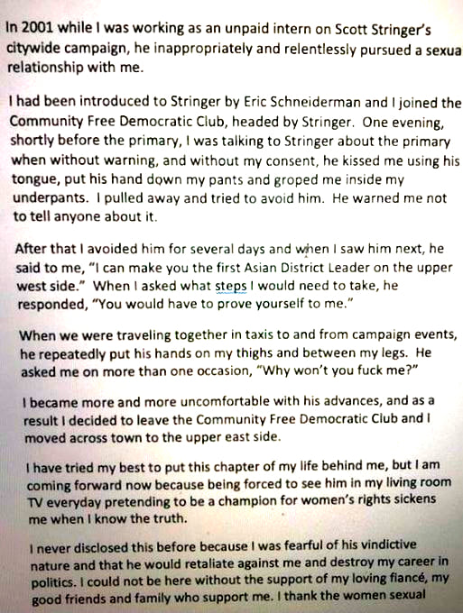 Today, a press statement was announced by Jean Kim. Kim, a female, was working as an intern back in 2001 for mayoral candidate Scott Stringer now standing at 3rd spot behind Yang and Adams. Stringer was campaigning for the public advocate then. She released her statement for all. Stringer's office denied the allegations. Stringer is running on the socialist agenda backed by the Democrat Socialist Party. His backers have not responded but implied it's a political hit job in time for election.