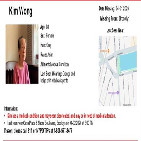 Kim Wong, Female/Asian/98. Last seen near Cass Place &  Shore Boulevard, Brooklyn. Kim has medical conditions, may seem  disoriented, & may need medical attention.