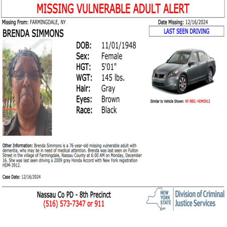 Brenda Simmons, F/B/76 from Farmingdale, NY. Missing has dementia & may be in need of medical attention. Vehicle: 2009 gray Honda Accord w/ NY license plate number HDM3912.