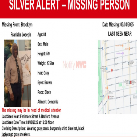 Franklin Joseph, male/black/84, from Fenimore Street and Bedford Avenue in Brooklyn. The missing has dementia and may be in need of medical attention.
