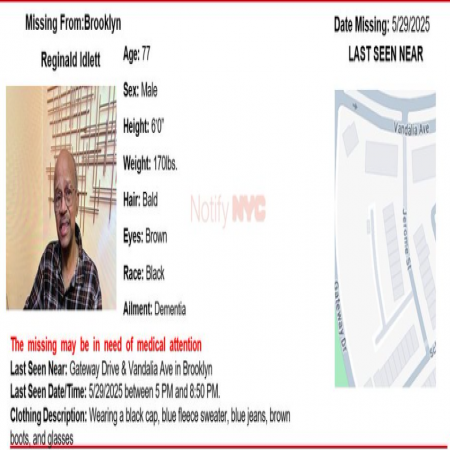 Reginald Idlett, M/B/77, from Gateway Drive and Vandalia Ave, Brooklyn. Missing has dementia & may need medical attention.