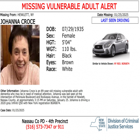 Johanna Croce, F/W/89 from Hewlett, NY. Last seen driving gray 2020 Infiniti Q50 with license plate number BGR6874.
