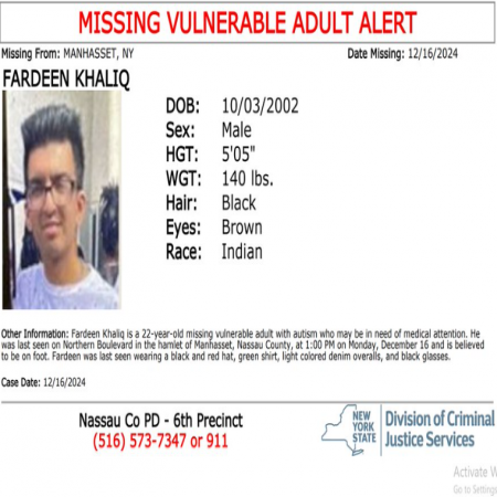 Fardeen Khaliq, male/Indian/22, from Manhasset, Nassau County. Fardeen Khaliq has autism & may need medical attention.