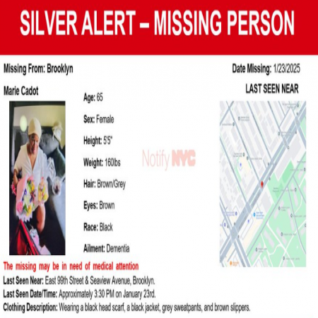 Marie Cadot, F/B/65 from the area of East 99th Street and Seaview Avenue, Brooklyn. The missing has dementia and may be in need of medical attention.