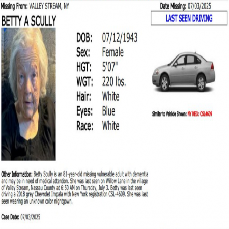 Betty A. Scully, F/W/81 w/dementia driving a grey 2018 Chevrolet Impala NY CSL 4609, Valley Stream, NY. Seen?