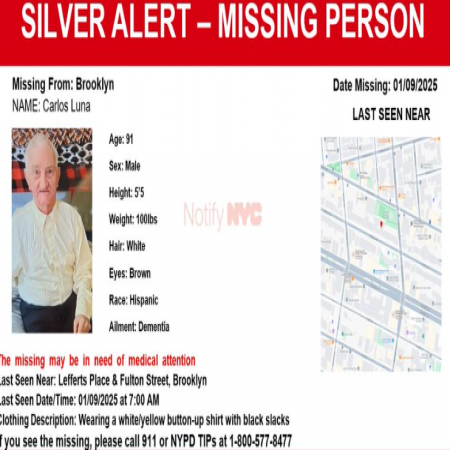 Carlos Luna, M/H/91 from the area of Lefferts Place and Fulton Street in Brooklyn. The missing has dementia and may be in need of medical attention.