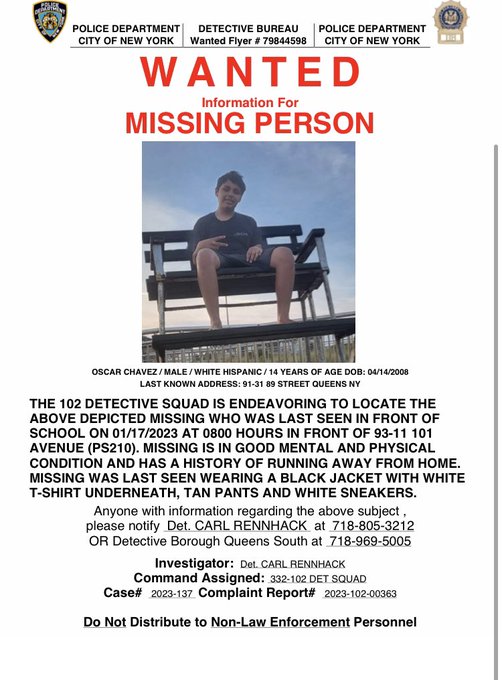 The 102 Precinct detective squad is endeavoring to locate Oscar Chavez, Oscar is 14 years old and was last seen in front of 93-11 101 Ave. (PS210) at 0800. Any information please call the numbers on the Flyer.