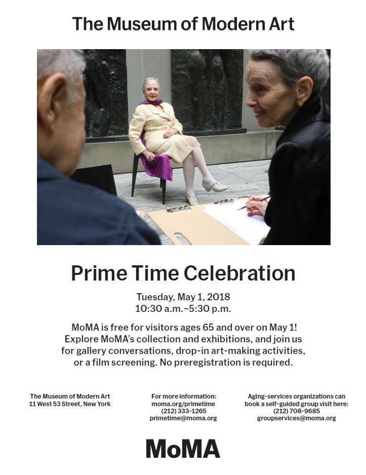 The Museum of Modern Art located at 11 W 53rd St in Manhattan is have its Prime Time Celebration. Tuesday, May 1 from 10:30am to 5:30pm for seniors 65 and over for free. Open to the public.