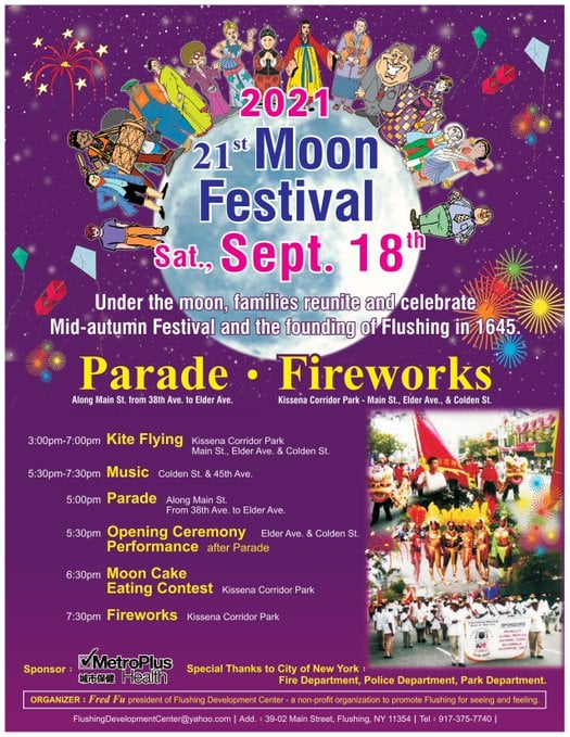 September 18 from 3pm to night, Flushing will have Moon Festival. Fireworks, parade, music and much more. It will be on Main Street by Booth Memorial Avenue to Colden Street vicinity. Drivers are advised to use alternate traffic. The event is open to the public.