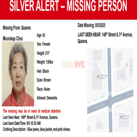 Moonkap Choi, F/A/83 from the area of 148th Street and 3rd Avenue in Queens. The missing has dementia and may be in need of medical attention.