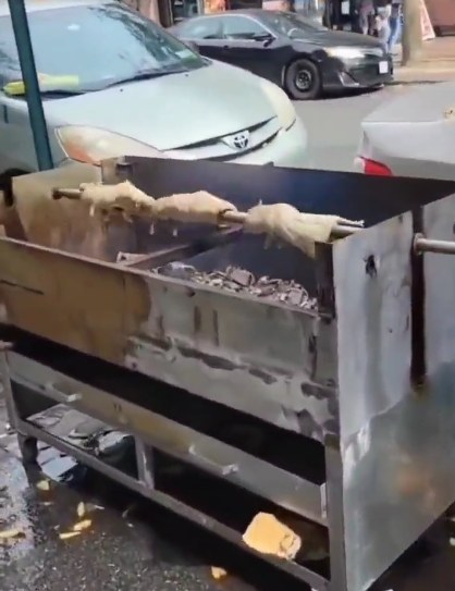 In Flushing, a vendor is roasting ducks on the grill by the Main Street sidewalk.