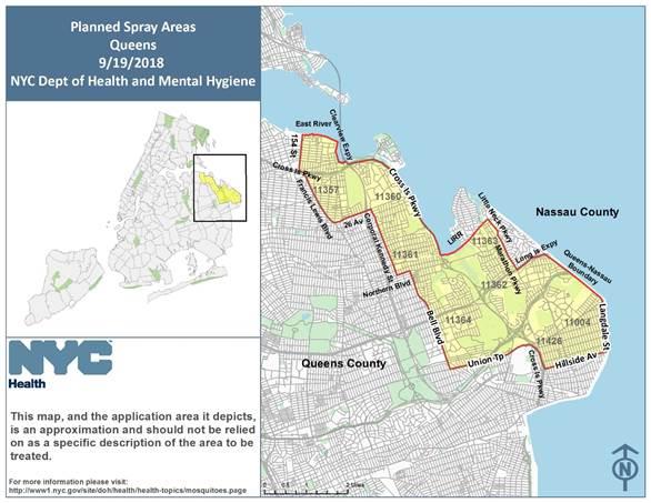 The NYC Health Dept will be servicing from New Hyde Park, Floral Park, Glen Oaks to Bayside with pesticide spraying to minimize mosquitoes. It will be done with a commercial truck. Residents are advised to stay indoors during spraying. The schedule is for September 19 from 8:30pm to 6am on September 20. In case of weather, it will be done the next day.