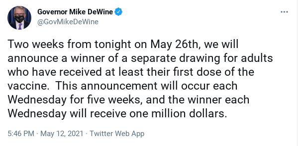 Ohio adults who have received their first COVID-19 shot will be entered into a drawing. 5 winners will be chosen, and each will win 1 million dollars. The money will come from existing federal Coronavirus Relief Funds, says the governor. By June 2nd, the governor is lifting almost all pandemic health orders. https://thepostmillennial.com/breaking-ohio-governor-dewine-lifting-nearly-all-pandemic-health-orders-on-june-2nd