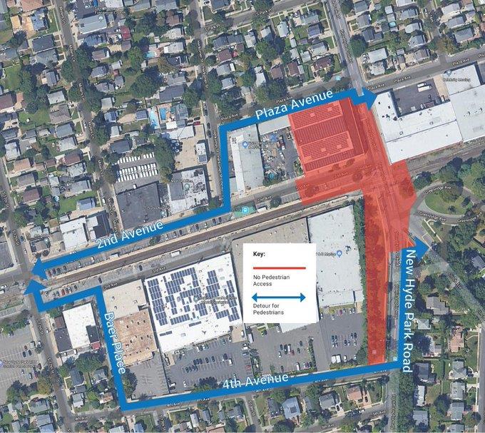 Starting February 3, the New Hyde Park LIRR station will access a temporary 10 car platform from 2nd and 3rd Avenues between South 12 and South 8 Streets. Pedestrian detour routes will be in place and 100 temporary parking spots for commuters available at 124 Covert Avenue. The crossing bridge is expected to complete by July 12. The roadway below the bridge is except to open by Summer 2020. There will be five lane roadway and pedestrian sidewalks below the tracks.
