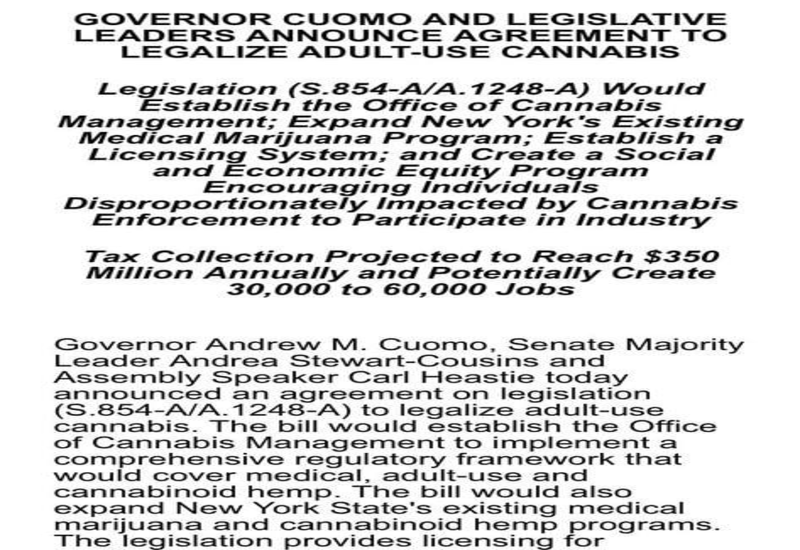 The NY governor with Assembly majority and Senate majorty ironed the deal to legalize recreational marijuana. The bill is now official in NYwith potential income of $350 million and 30,000 to 60,000 jobs potentially for the state. A vote to make NY the 15th state to legalize is expected within days and the governor will sign it to make it law. Let the vape begin.