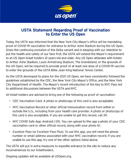 Until today afternoon, no masks, vaxx or test required for the entry announced by the tennis association. However, the most powerful man in a city with the most population in the USA announced otherwise. You must show your paper before entering so bow down and oblige.