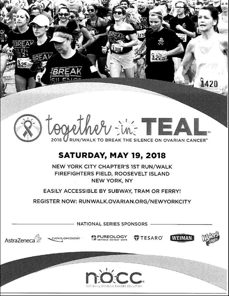 Saturday, May 19 at Firefighters Field in Roosevelt Island. The event is NYC chapter of National Ovarian Cancer Coalition. Open to the public.