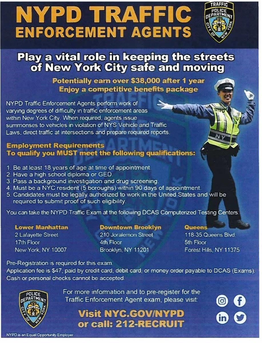 NYC is hiring Traffic Agents and its testing centers are open for candidates. One is in Queens.
