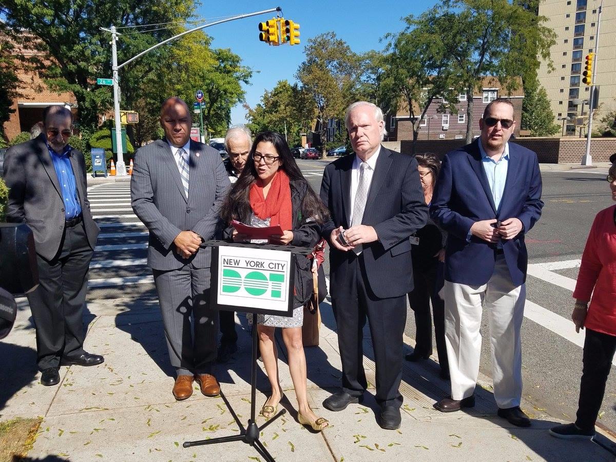 Expected to be done mid-September but finally done on Monday, October 2 afternoon with fanfare and press conference. The left turn signal at the intersection of Corporal Kennedy Drive and 26th Avenue will have indicator alerting drivers to make turns while waiting on rotation basis. If there are no vehicles making left turns, then it will remain idle to allow traffic flow for the other directions. In 2016, residents complained to Mayor di Blasio during town hall meeting. Before that, residents complained for 20 long years. ?This signal is now activated only when there are vehicles waiting in the left turn lane ? if no one is waiting, the left turn phase is skipped,? said DOT Queens Commissioner Nicole Garcia. ?That cuts unnecessary delay for pedestrians and drivers making other movements, which not only enhances efficiency, but also safety, since people subject to excessive delay can drive unpredictably. We thank the local elected officials for their determination to make these improvements a reality.? This is the first sensor activated device in NYC called, "pucks", a round black metal added to the road where the left turn signal is.