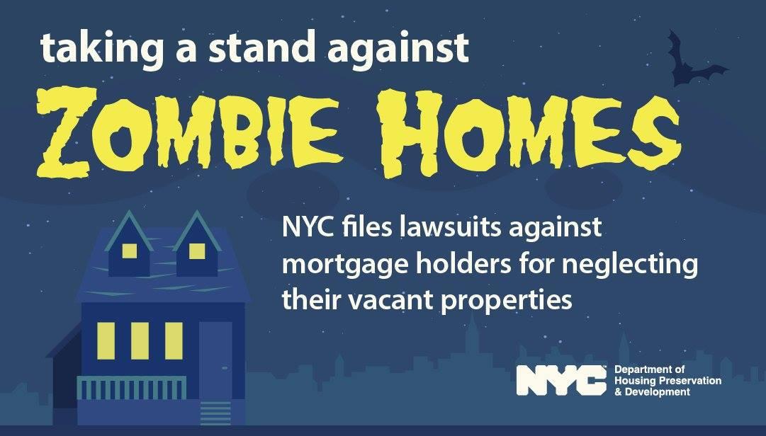 The mayor's office filed lawsuit as the first against banks for zombie homes littered with squatters after foreclosure. As part of distressed properties under foreclosure, homes are not being maintained and neighbors are complaining. The law, Zombie Home was passed in New York State in 2016 banks must maintain their properties in good standing after original owners bailed out. However, in NYC, Dept of Housing Preservation can issue violations and a court order to maintain the property but banks counter leading to lengthy legal battle despite millions in fines pending. The banks named are Wells Fargo, Citi and etc. Beside the banks, the city is going after contractors assigned to manage properties.