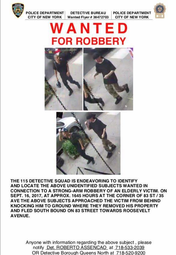 The incident happened on September 16 at 83rd Street and 35th Avenue around 4:45p, two suspects in the pic approached an 89 year old man and knocked him to the ground. Both suspects took off after taking the victim's keys. Both suspects are male, Hispanics.
