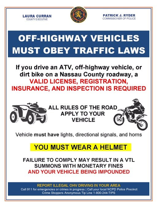 Nassau County released a statement of ATV, dirt bikes and off highway vehicle allowed but with helmet, license, registration and inspection stickers. This is prohibited in NYC. If the rules are not followed then fines will be issued and then taken away if not paid.