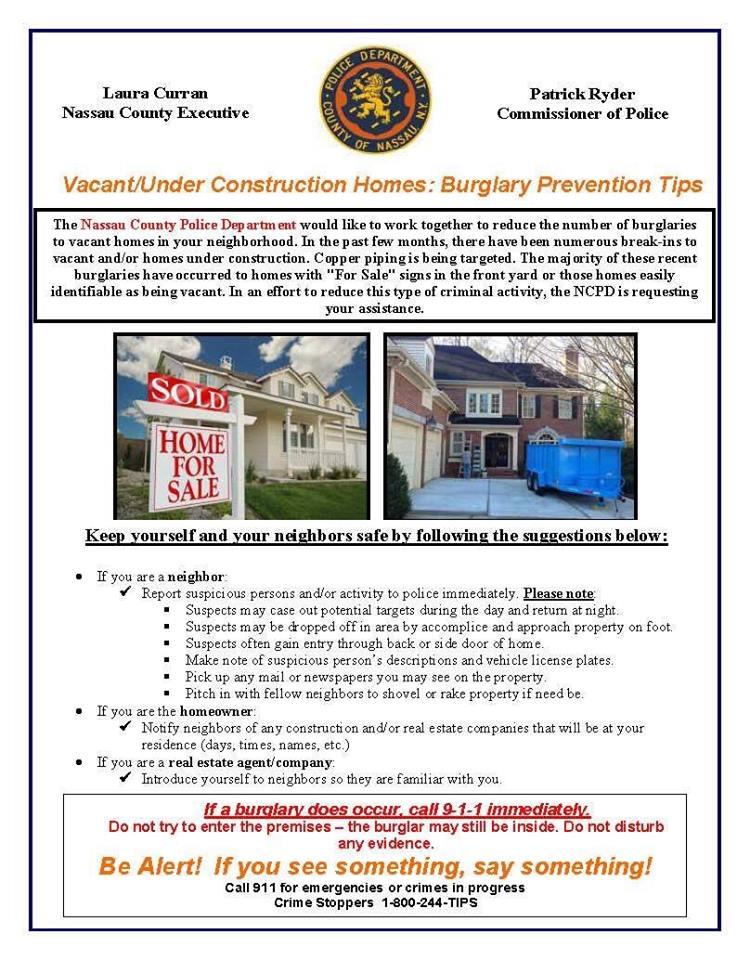 The Nassau County police reported of burglaries at vacant homes listed on the market for sale and under construction. Multiple suspects entered homes and stole items from inside including tools, personal items and equipment. Police released a flyer with information to safeguard from such crimes.
