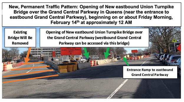 The long awaited bridge for Union Turnpike in Kew Gardens where construction continue to loom will open a new bridge eastbound tomorrow crossing the Grand Central Parkway. More works are to be done as part of the Dept of Transportation's $365 million revamp project of Kew Gardens Interchange. The bridge will open midnight and the public can attend with or without vehicles. This is on eastbound after the courthouse and Queens Blvd.