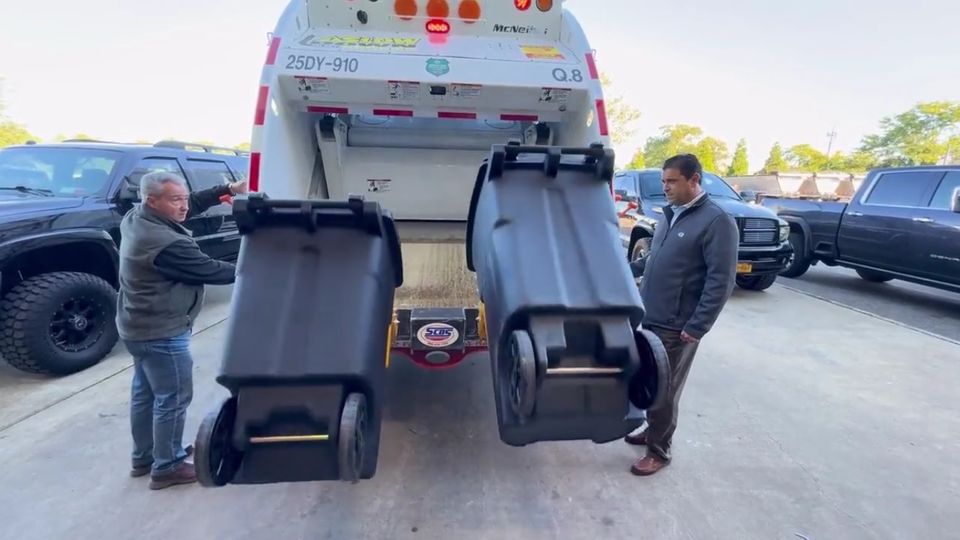 The Sanitation Dept introduced the new vehicle that does the container pickup just like the Bounty towel commercial with The Quicker Picker Upper. Just roll to the truck and press the button. The truck will do the rest so workers don't have to lift them at all.