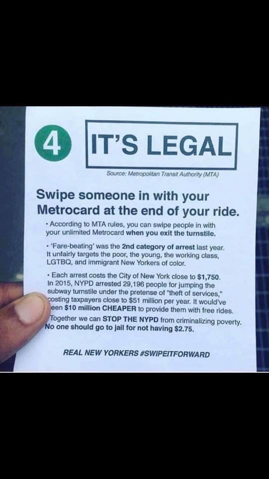 A group of non-profits in NYC are passing around flyers in the subways to let those who can't afford $2.75 ride. The information shows according to MTA is legal to swipe people with someone who possess unlimited rides blaming NYPD for target arrests. Two people who were passing around are volunteers but stated the non-profit raises money from the poor to support their cause. Most of the non-profit groups spend 90% of the fund raised on administration and the rest for cause. According to NYC Comptroller, Mayor de Blasio has not reported $1.8 billion unaccounted which the majority of City Council members refuse to investigate. The mayor's plan of half fare for low income residents are also stalled. Also, NYC Comptroller reported the low income rate is 73% with 29% from that is poverty. This is a major swing for politicians to gain votes from the majority of 73% to their favor. After weed arrests, the second is fare jumping. Third is assault.