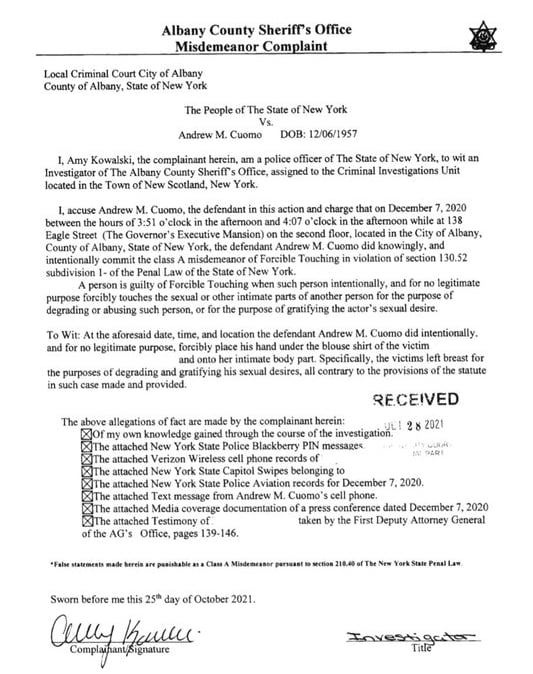Criminal complaint against former NY governor alleges the then-governor forcibly grabbed a woman's breast at the state's Executive Mansion last December. It's a misdemoner charge.